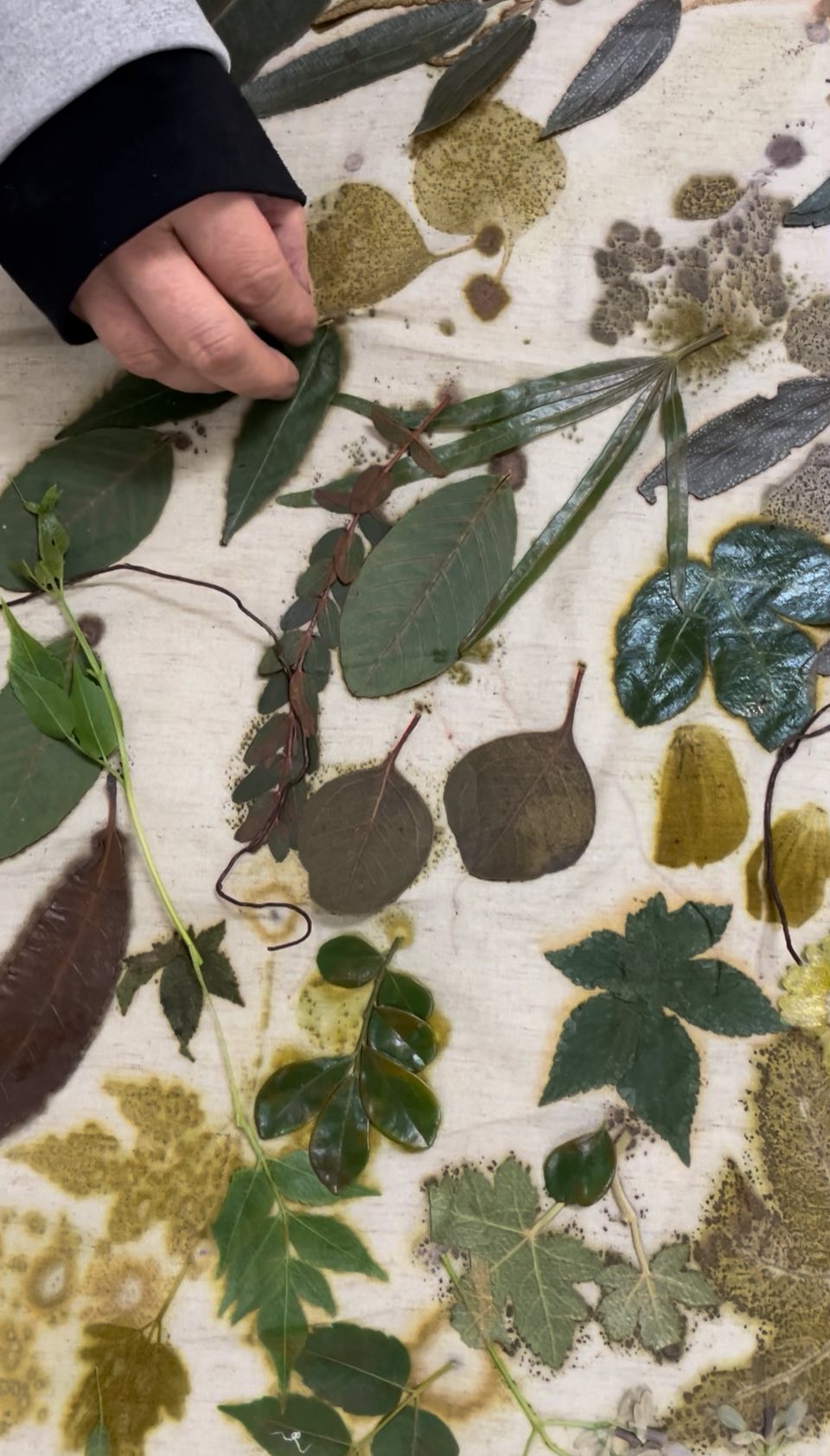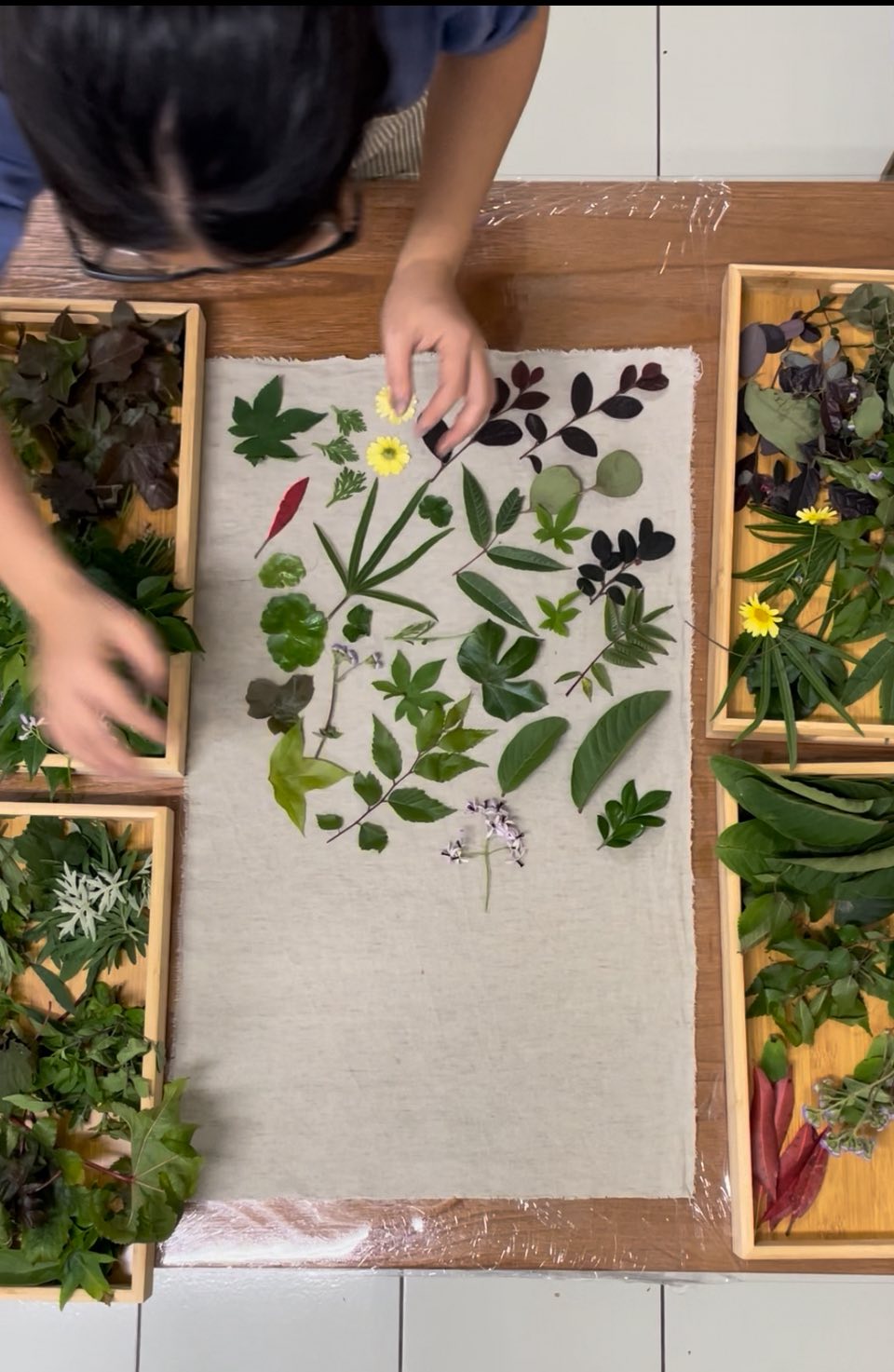 它不是大量複製的印花,也不是制式化的色彩堆疊,而是透過植物本身的葉形、紋理與天然色素,慢慢在布料上留下屬於自然的痕跡。每一次展開布面,都像打開一份無法完全預測的禮物,安靜、細膩,卻充滿生命感。