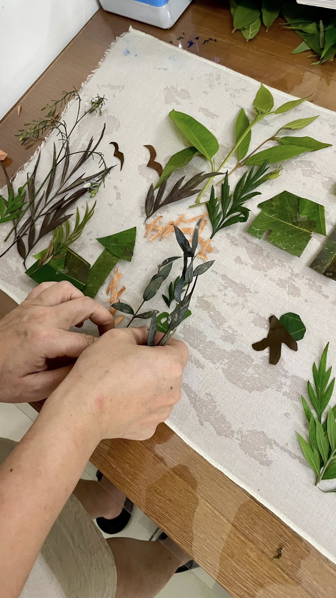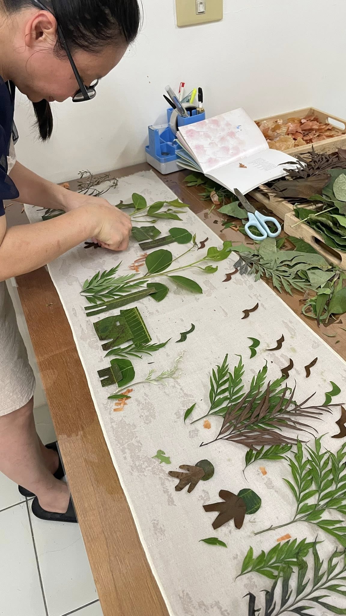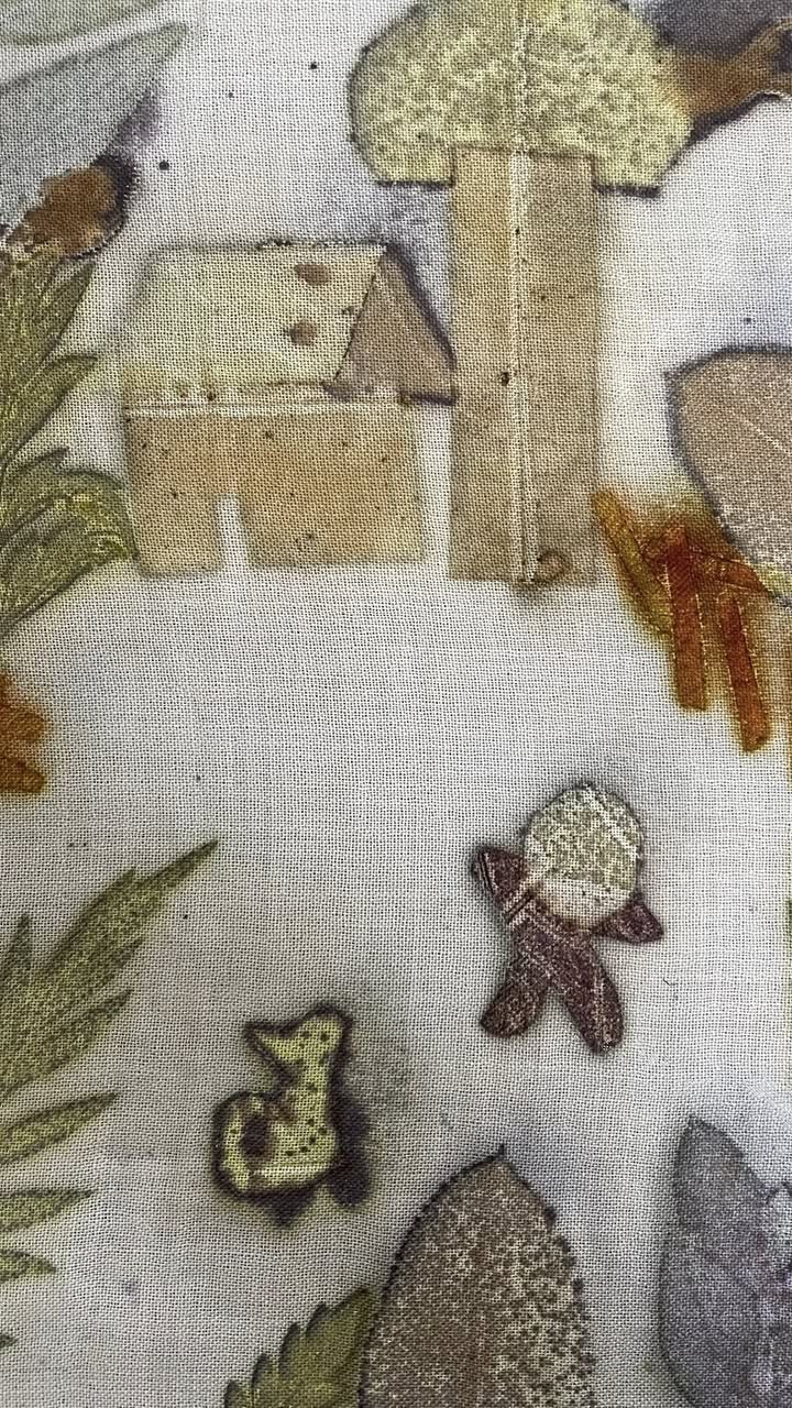 我喜歡把這樣的感受留在布上。透過花葉移印染,讓植物的紋理、葉脈的線條與自然留下的色彩,慢慢停駐在羊毛上。每一件作品都像是一段被保存下來的風景,也像一則能被披在身上的故事。